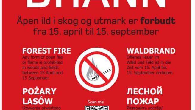 Skogbrann Åpen ild i skog og utmark er forbudt fra 15. april til 15. september Publisert 22.04.2026 kl. 10.48